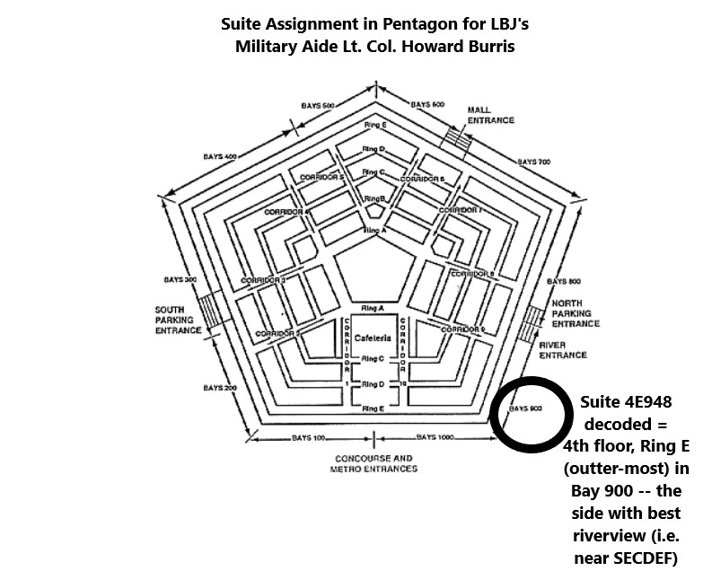 As an illustration of what Col. Burris described in the second paragraph of his memo — and the importance which the Pentagon gave to its liaison to the Vice President — the diagram below shows the location of his office, next door to Secretary McNamara’s office. There can be no doubt how high the colonel was placed — arguably, even figuratively higher than the SECDEF himself — given the value having true raw intelligence delivered to LBJ, not the sugar-coated variety being fed to the Secretary and the President, as will be demonstrated below.