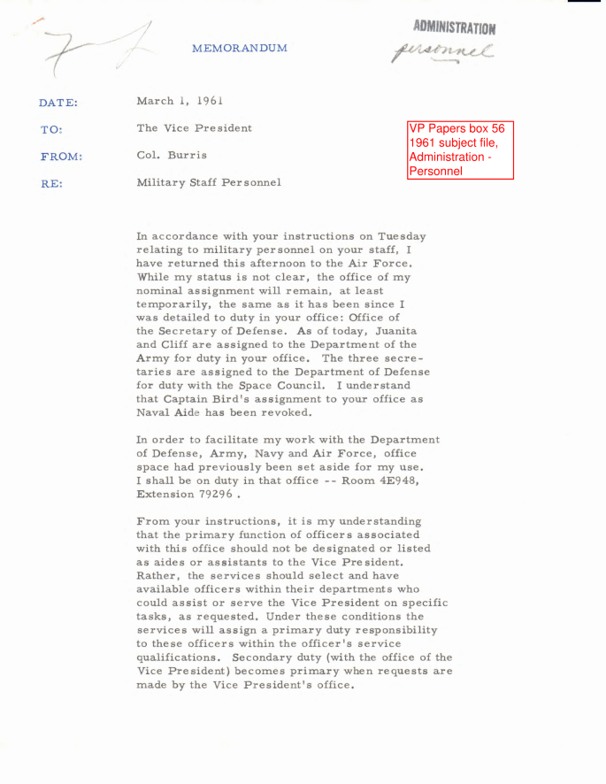 Thus, the memo proves conclusively how Lyndon Johnson quickly maneuvered Col. Burris into being his primary contact into both the Pentagon and intelligence agencies, certainly with the acceptance of the JCS. It’s all in the third paragraph: He wants to keep Burris’s role “under the radar” so that he will remain his own personal secret agent. It also explains why JFK had no idea that LBJ had this secret “back channel” into all those military and intelligence agencies.