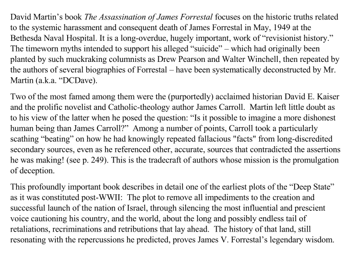 I had previously cited Mr. Martin’s original research on Forrestal’s death (posted on his DCDave website) when I wrote a piece about it in LBJ: From Mastermind to The Colossus (see pp. 222-234). Within the following paragraphs I’ve excerpted and reedited a summary of how Lyndon Johnson had insinuated himself into a high-level Deep State plot to “neutralize” James Forrestal: