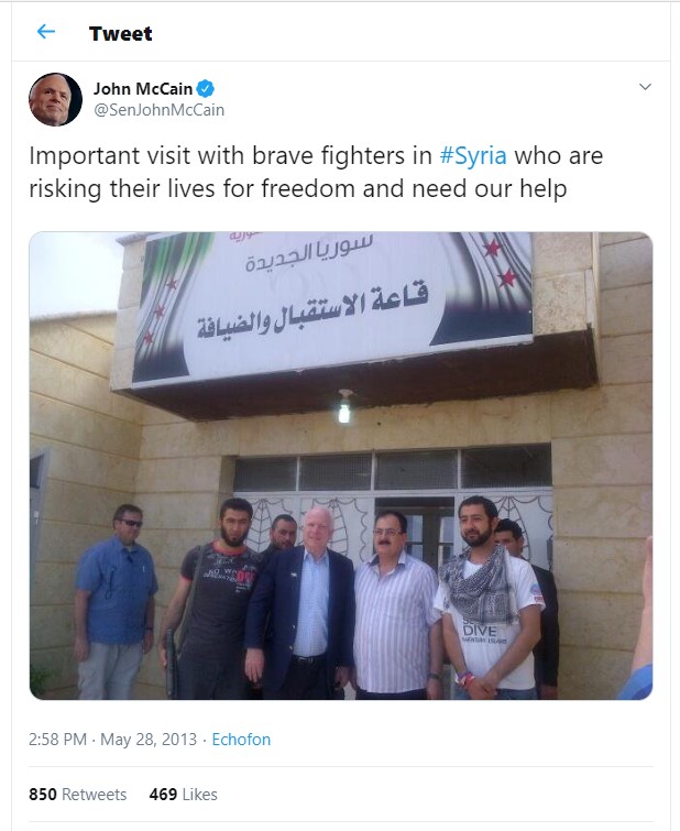 John McCain with Syrian terrorists for whom he, and President Obama, accepted their promises to fight the Assad and Russian forces on behalf of the U.S. — one of the many sordid mistakes made during that ignominious era.