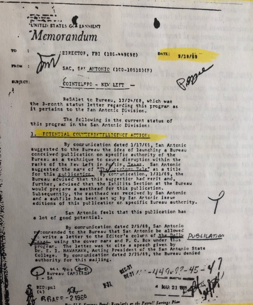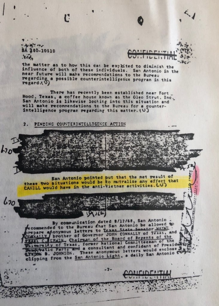 Cahill’s name was added to a “Security Index” file by the San Antonio field office of the FBI. A document, copied below, from the Special Agent in Charge (SAC) with a corrected date of 9/10/68 was released, through a FOIA (Freedom of Information Act) request (though his name was redacted in the primary section, it was not redacted in another section on page 2, evidently in error). The document indicated that the SAC had sent a recommendation to FBI Headquarters on May 28th that: “a rumor be started” about Cahill being a “Narcotics Agent” because it was felt doing so would disrupt the “New Left” and tend to “isolate [Cahill’s] influence.” It further indicated that a response from HQ on June 11th disapproved that suggestion but proffered a replacement “possible disruptive measure that if recent narcotics arrests had been made in Austin, a leak through New Left sources that (Cahill) is a police informant might be used.”