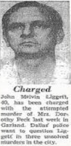 Dorothy managed to regain consciousness and stumbled her way out of the fire to a neighbor’s house to call the fire and police departments. And she knew her attacker, John Melvin Liggett, because he had accompanied her home from a bar the night before. Since she was able to wake up and leave the burning bedroom and identify him, John M. Liggett was arrested and subsequently investigated for several other Dallas area murders involving similar arson attempts to destroy any evidence left behind by the killer.