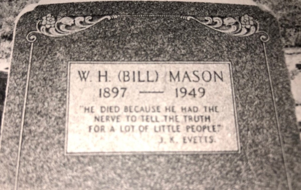 On July 29, 1949, Mason was shot and killed by Deputy Smithwick, who had counted on being freed by Parr or his political benefactor Lyndon Johnson for his services in eliminating that thorn, Bill Mason, from both of their backsides. But he went to trial, where he was found guilty of murder with malice (i.e. 1st Degree Murder) and was sentenced to life in prison.[4]