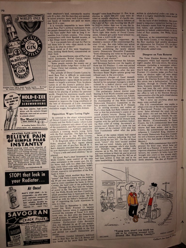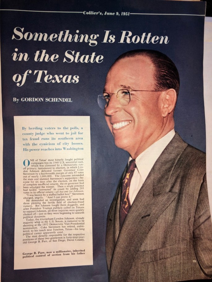 The pinnacle event of George Parr’s infamous career — the manufacture of 203 fake ballots in the 1948 election that caused Lyndon Johnson to “win” his seat in the Senate — is among the subjects covered within this historically important news article. Since the article was published only two years after Johnson was sworn in, it served as an excellent record of how the two of them were able to derail democracy so that Lyndon could continue his climb up the political ladder. In another, more esoteric, sense, it portended what the ascension of LBJ would mean for the future of America: That nothing, or anyone, would stand in his way to achieve his goal — to become President of the United States.