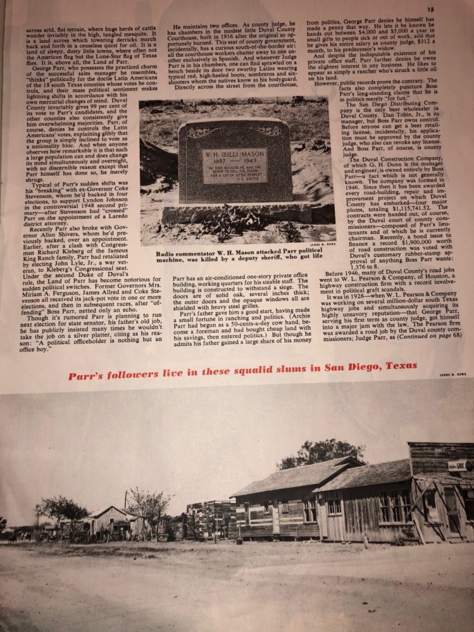 The primary “muckraking” story in the issue dated June 9, 1951, “Something is Rotten in the State of Texas,” was certainly embarrassing to a number of people, but the top two contenders had to be Lyndon Johnson and his friend George B. Parr. Parr was known as the “Duke of Duval” for his complete control of a political machine that wielded absolute control over his own county, as well as neighboring Jim Wells County and Nueces County; through alliances with the bosses of many other counties, he had substantial influence and control of all of South Texas, thus he also “exerted a powerful influence on state and national politics.” [2]