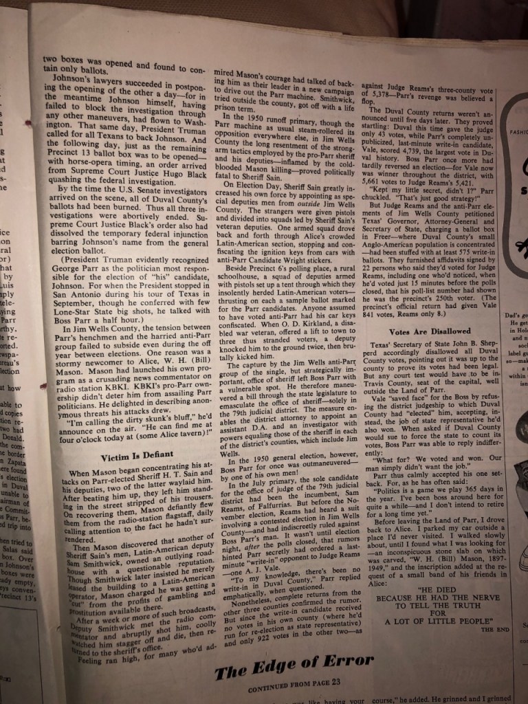 The article also covered the murder, eight months after the stolen election (to be examined below), of Bill Mason, a radio reporter who had begun reporting on his investigation of the frauds used by Parr to ensure that Lyndon Johnson would win.
