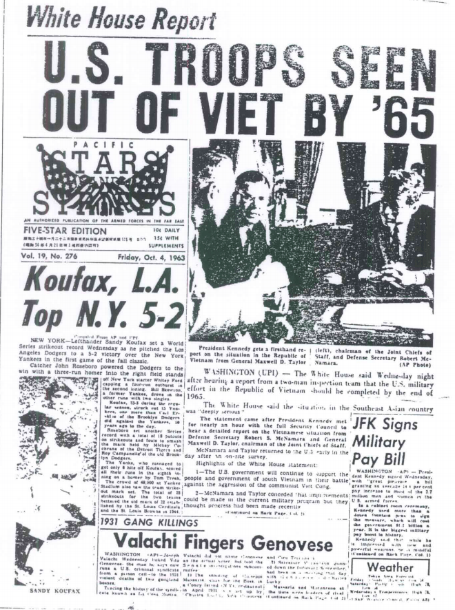 The Stars and Stripes newspaper reported six weeks before his assassination, as he planned ahead for the 1964 election, that JFK had sent Defense Secretary Robert McNamara and head of the Joint Chiefs of Staff General Maxwell Taylor to Vietnam on an “inspection” mission to provide a basis to accomplish his own pre-established objective: To bring 1,000 of the military advisors home by that Christmas, and to bring all the remaining men back after his reelection, by the end of 1965.