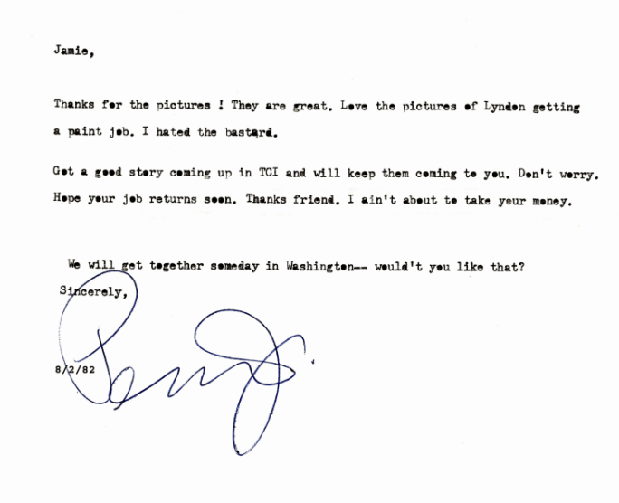 The letter to the right, written by Penn Jones to James Feliciano on August 2, 1982, references the photos below of LBJ’s limo being “painted” by war protesters in Melbourne Australia in October, 1966.