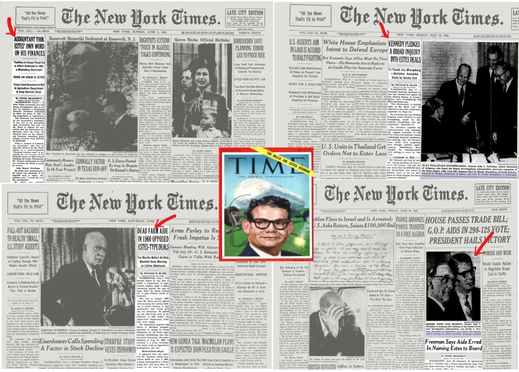 Between April and August, 1962, hundreds of articles appeared in all of the national and local news media about the Billie Sol Estes scandal, one of many major scandals involving Lyndon Johnson. If anyone missed it in their local daily or weekly newspapers because they didn’t read them, they would have surely seen it on the evening news on television, and if not that, then the radio news, whether in local broadcasts or nationally syndicated shows with commentators like Paul Harvey, Walter Winchell and Lowell Thomas. The point is, no one over 10 years old and cognitively aware of his or her own existence, could have escaped reading or hearing the name Billie Sol Estes for a period of six months in the middle of 1962.