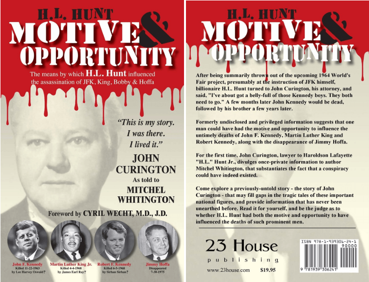 Well, maybe not really “new” evidence technically, but new to me anyway. Thanks to the intrepid “old school” journalist (i.e., coming up in the days when the term intrinsically meant “integrity”) and former President of Times Books, Thomas Lipscomb, who recently brought to my attention the statements John Curington made in his 2018 memoirs. It should be understood that Curington’s career with Hunt was built around his abilities to conduct Hunt’s devious deals and that might cause one to view his statements skeptically; however, the book was written decades after Hunt’s passing and—like Billie Sol Estes’ later ruminations—old age generally brings with it a degree of penance-seeking for earlier regrettable acts. The need to find peace within one’s soul generally imbues late-age admissions with essential truth.
