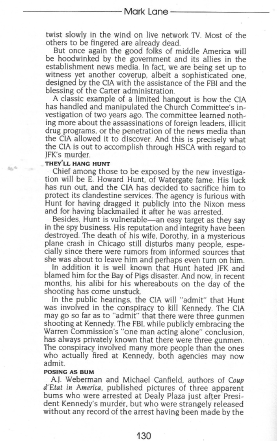 E. Howard Hunt’s Presence in Dallas on Nov 22, 1963 — and the Veracity of His Confessions Forty+ Years Later October 31, 2020November 2, 2020 by lbjthemasterofdeceit, posted in Uncategorized The second of four pages of Victor Marchetti’s August 14, 1978 article in the Liberty Lobby’s magazine The Spotlight, reproduced by Mark Lane in Plausible Denial: Share this: Click to share on X (Opens in new window) X Click to share on Facebook (Opens in new window) Facebook Like Loading... Related Pages: 1 2 3 4 5 6 7