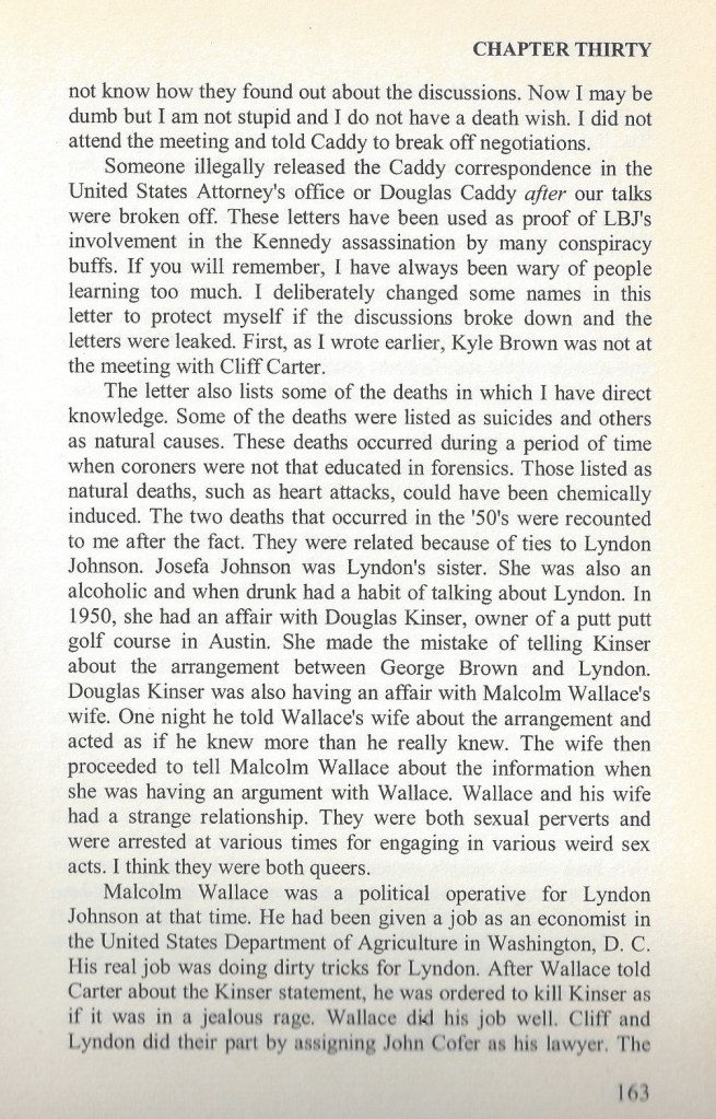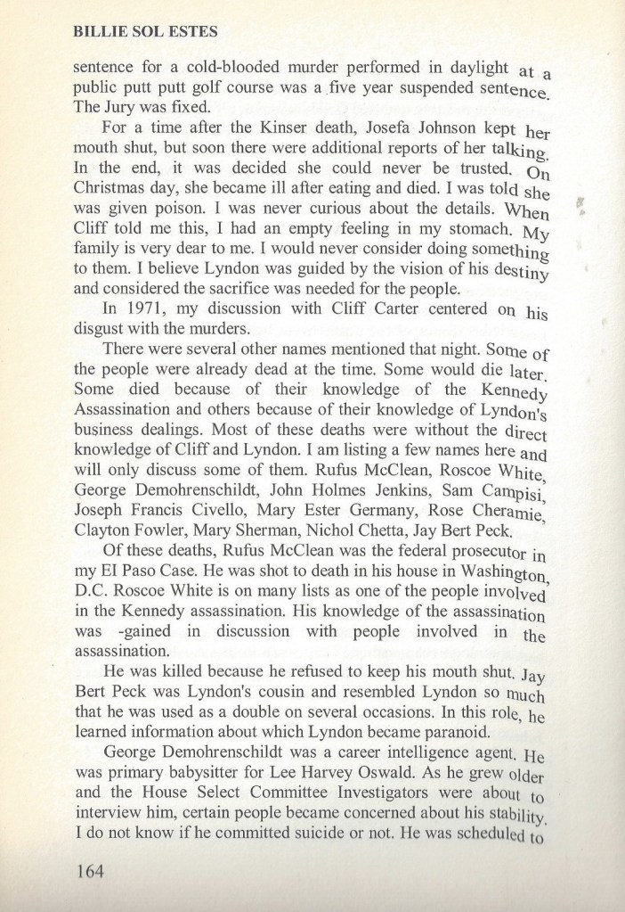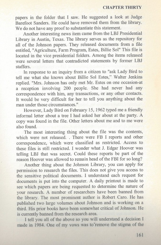 Billie Sol Estes: A Sordid History Atoned: “Sol” Finally Vindicated December 16, 2020December 6, 2022 by lbjthemasterofdeceit, posted in curated PAGE 7 —The Seven-Page Chapter 30 from Billie Sol Estes — A Texas Legend Share this: Click to share on X (Opens in new window) X Click to share on Facebook (Opens in new window) Facebook Like Loading... Related Pages: 1 2 3 4 5 6 7