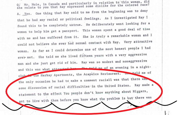 The first of the following two examples of Huie’s lies was in fact disproven in 1978 by HSCA investigators, yet it was then glossed over as though the charges of racism on Ray’s part were merely inadvertent error, instead of being seized upon as positive proof of Huie’s blatant prevarications.