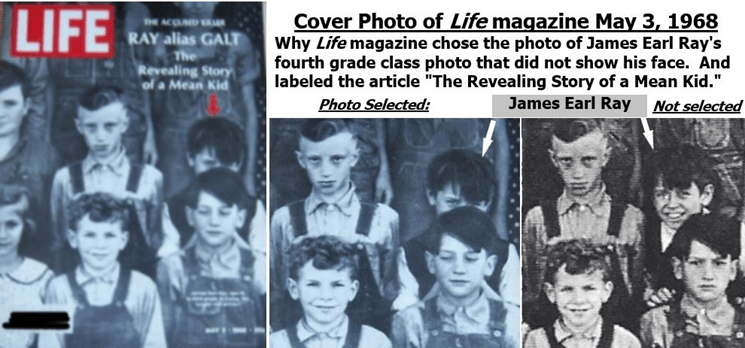 Merely making the rather provocative decision to use a photo that didn’t fully show Ray’s face – rather than one that did – must have taken some amount of deliberation on the part of senior editors, probably even the highest-level executives. Someone very high in the management hierarchy must have made that rather strange choice, given the audacity of the act – which ran the risk of belying the magazine’s intent to “frame” Ray for his mischievous childhood – with the implicit suggestion that the confusing photo portended the face of a future murderer of a world figure, despite the fact that the person highlighted by that photo was not even the person being accused.