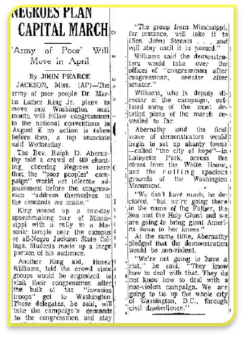 [21] Pearce, John, “Negroes Plan Capital March: Army of Poor Will Move in April,” The New Orleans Times-Picayune, (AP) 3-21-68 Section 2, page 29 (p. 58 on digital copy):