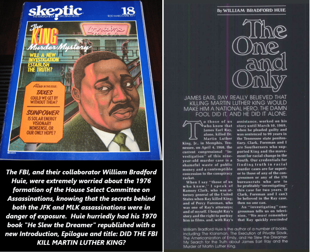 These two purposely deceptive acts of Huie are representative of the dozens – probably hundreds, if time and space permitted a complete destruction of his shameful account – of his series of lies and conclusively prove the assertion that his books were written to provide the foundation for all other aspects of the FBI’s, and, in broader scope, the Department of Justice’s, extensive efforts to keep the cover-up secret. The worst part of this sad saga is that the HSCA “investigators” — as the FBI, and certain of the officials running the House Committee — had originally done when they actually used Huie’s completely fabricated account as the basis of their investigations, as noted by the many dozens of citations made in the HSCA Report to his ignominious tome.