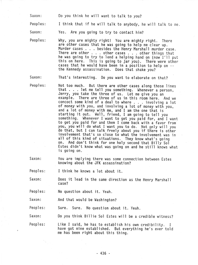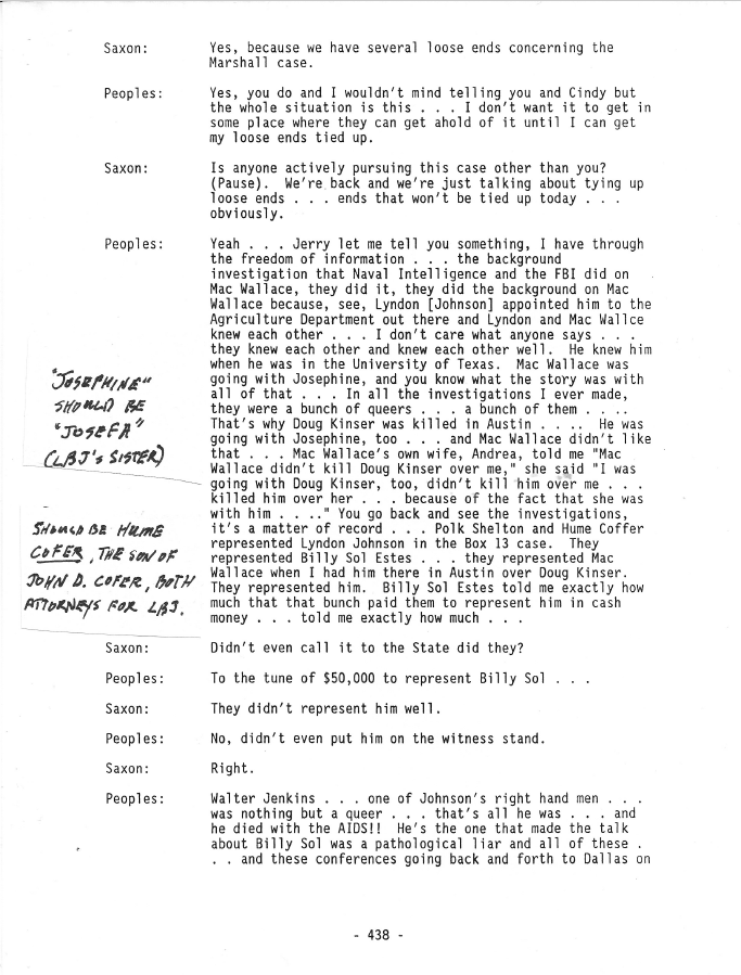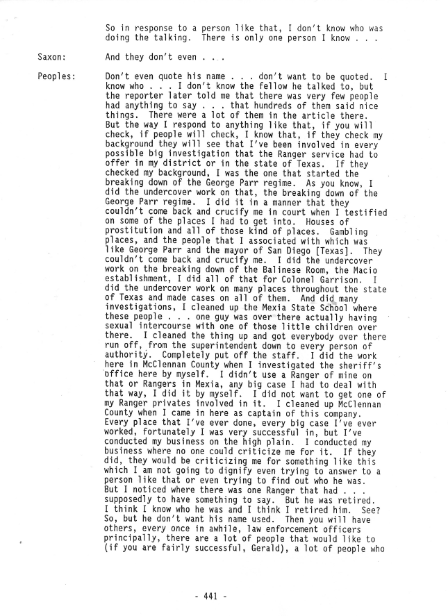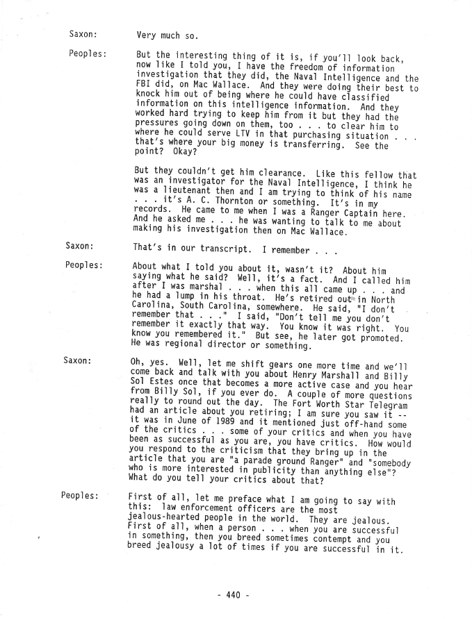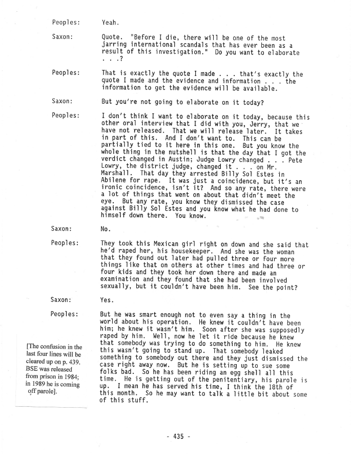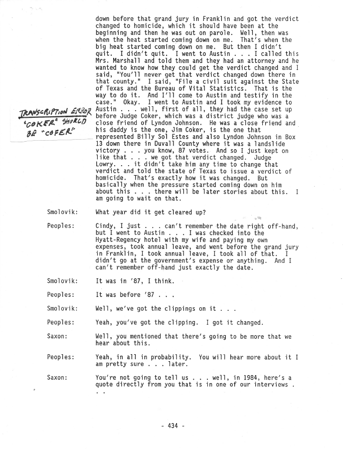 On August 15, 1989, four and one-half years after his original 1984 interviews with Gerald Saxton for the Dallas Public Library, Peoples sat down with Saxon again, as well as Cindy Smolovik, to review and update his earlier statements. These pages were appended to his earlier oral history such that the eleven pages below were numbered according to the previous sequence and are the final pages that were withheld from the public until 2012.