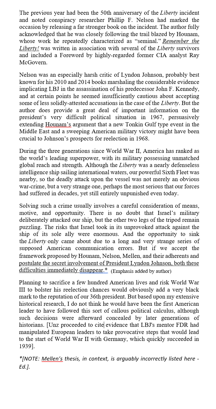 Insofar as Mr. Unz’s comment about how, “at certain points he [me] seemed insufficiently cautious about accepting some of less solidly-attested accusations in the case of the Liberty,” I believe that he is referring primarily (only?) to what I wrote on pages 180-181 regarding what survivor Larry Weaver stated.