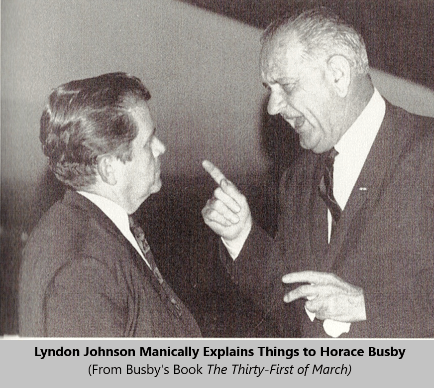 That Horace Busby put this story into his memoirs speaks volumes about his courage and integrity, despite having served so long as another one of Johnson’s enabler/sycophants (But, compared to others, like Moyers and Valenti for example, Busby was a saint, for this glimmer of truth alone).