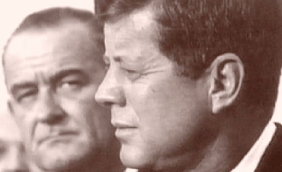 LBJ leers menacingly at JFK, like the high school bully he once was