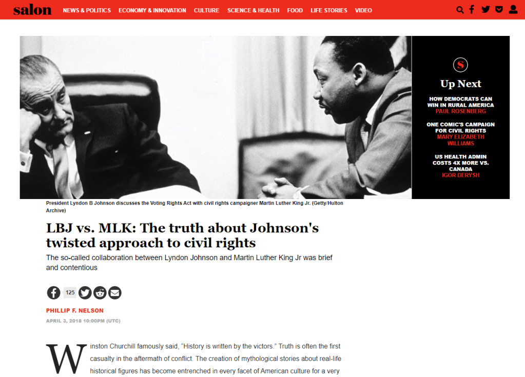 This article, titled “LBJ vs. MLK: The truth about Johnson’s twisted approach to civil rights,” was published in Salon magazine on the 50th anniversary of Dr. King’s assassination, in April 2018, based upon excerpts from the book.