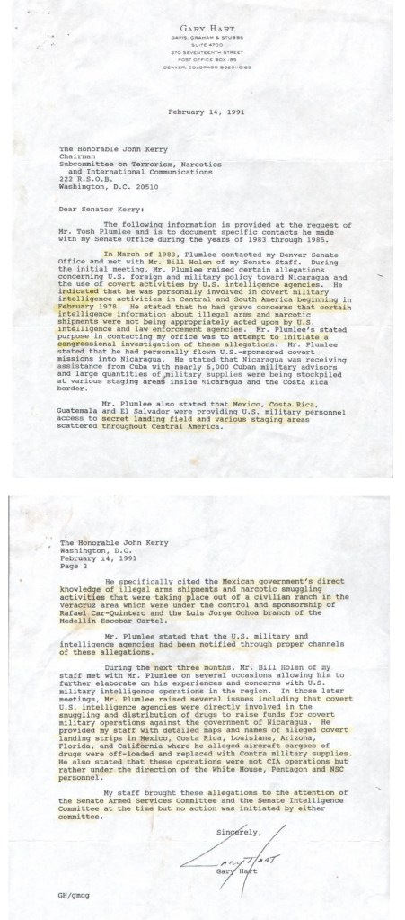 Senator Gary Hart (D-CO) summarized his, and his staff’s, extensive interviews with “Tosh” Plumlee in the following letter sent to Senator John Kerry, the chairman of the Subcommittee on Terrorism, Narcotics and International Communications in preparation for a 1991 reinvestigation of the same charges he had originally made eight years previous: