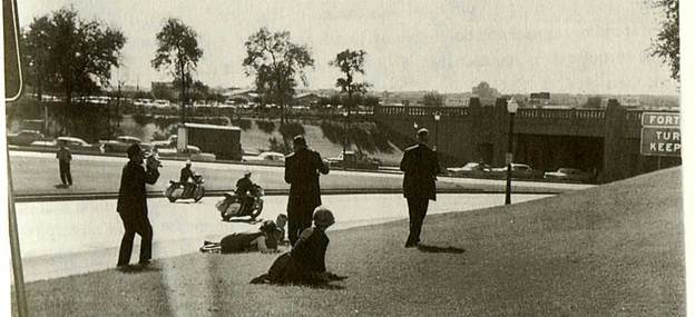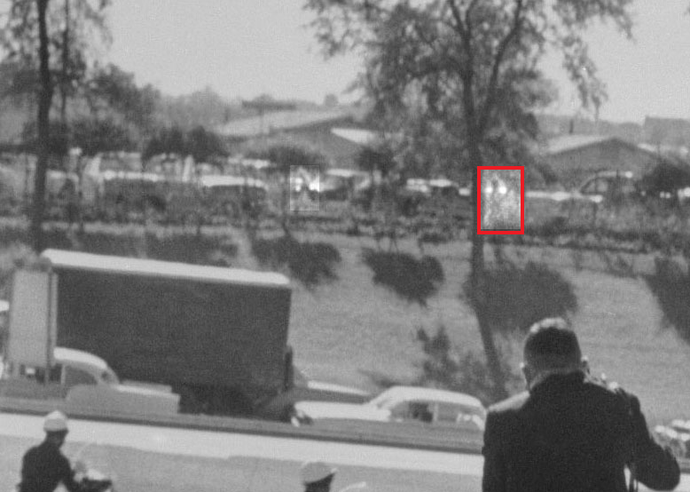 Plumlee has stated that he believes that the figure highlighted in the cropped photograph below might be one of the shooters (he and Sergio had already begun moving out immediately after the limousine had left the area; therefore would have already left the scene several moments before this photo was taken, as he described in the video clip that is presented after the photo):