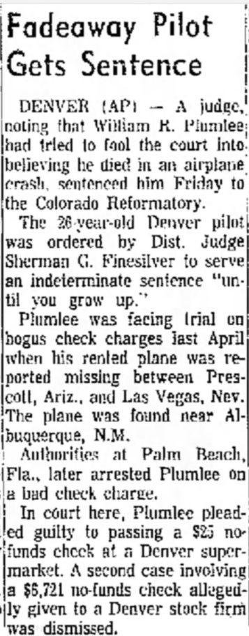 Judge Finesilver, essentially finding Plumlee uniquely guilty of not being “grown up,” sentenced him to an indefinite term in the Colorado Reformatory, beginning in April, 1964. He was finally released in January, 1965. This despite his already lengthy aircraft maintenance, flying and military / intelligence experience, as well as considerable unique experience with high-level Mafiosi. It should be apparent to most people, from this cursory review of the essential facts, what that “reform school” sentence was all about: A rather brutal warning to him to keep his mouth shut.