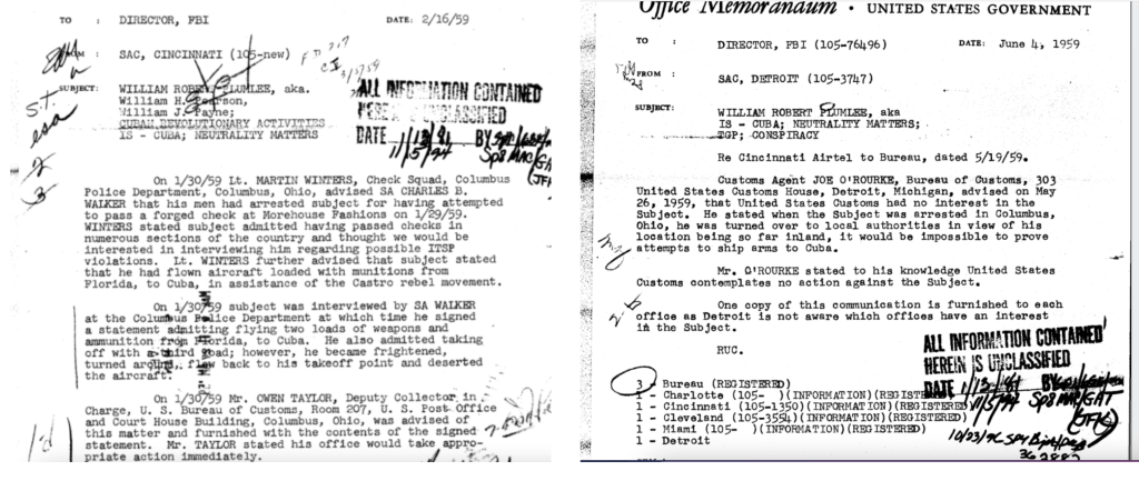 The case started out when an agent for U.S. Customs detained Plumlee after finding out his airplane was loaded with guns and ammunition. He was preparing to fly to Cuba on a CIA mission, from Columbus, Ohio in January, 1959. Plumlee stated that a man named “Sutor” had been involved in sending that cargo and the FBI had him under surveillance and had picked him up: “The plane that I was on was loaded by people who were tied to Sutor. The FBI wanted to know what I knew about Sutor, so they had approached me (but many in the ‘research community’ have stated that I went to them, which is untrue). The documents say that they went out of their way to find me . . . and I went out of my way to dodge them.”