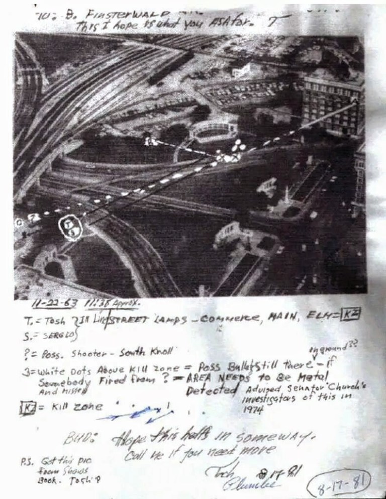 This drawing, with photo attached, was prepared by Tosh Plumlee originally on 11/22/1963 and subsequently furnished to the FBI in April, 1964, the Church Committee in 1975, HSCA investigators in 1976 and (as noted on the bottom) a copy was given to researcher Bud Fensterwald in 1981.