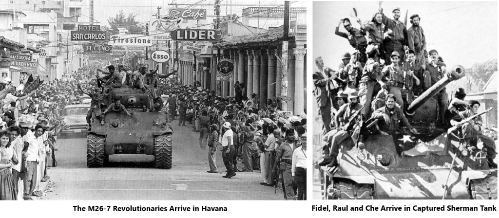 One week after Castro’s triumphant 1959, New Year’s Day overthrow of Dictator Fulgencio Batista, who fled Cuba and went into exile in the Dominican Republic, I watched from a Havana side street, as Castro and his rebel army marched into Havana Cuba. That was January 8, 1959. I was twenty-one years old. I watched Castro ride proudly on top of an American Sherman tank that his rebel band of soldiers had captured earlier from Batista’s army. The massive Cuban crowd cheered, as Fidel passed. They shouted “Viva El Castro, Viva El Castro” — while others, in English, yelled “Long Live Fidel”.